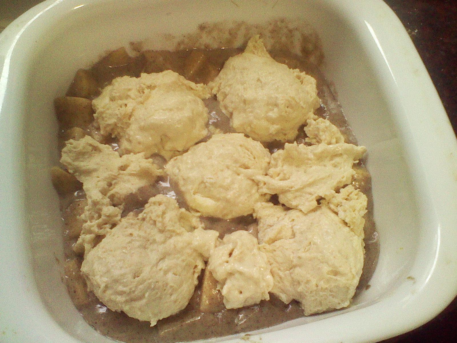 Spoon your apple mixture into your greased casserole dish. Now, using a large spoon or cookie scoop add dollops of the dough. Don’t worry about filling in every space with dough as it will rise as it cooks and all the nooks and crannies will get filled in.