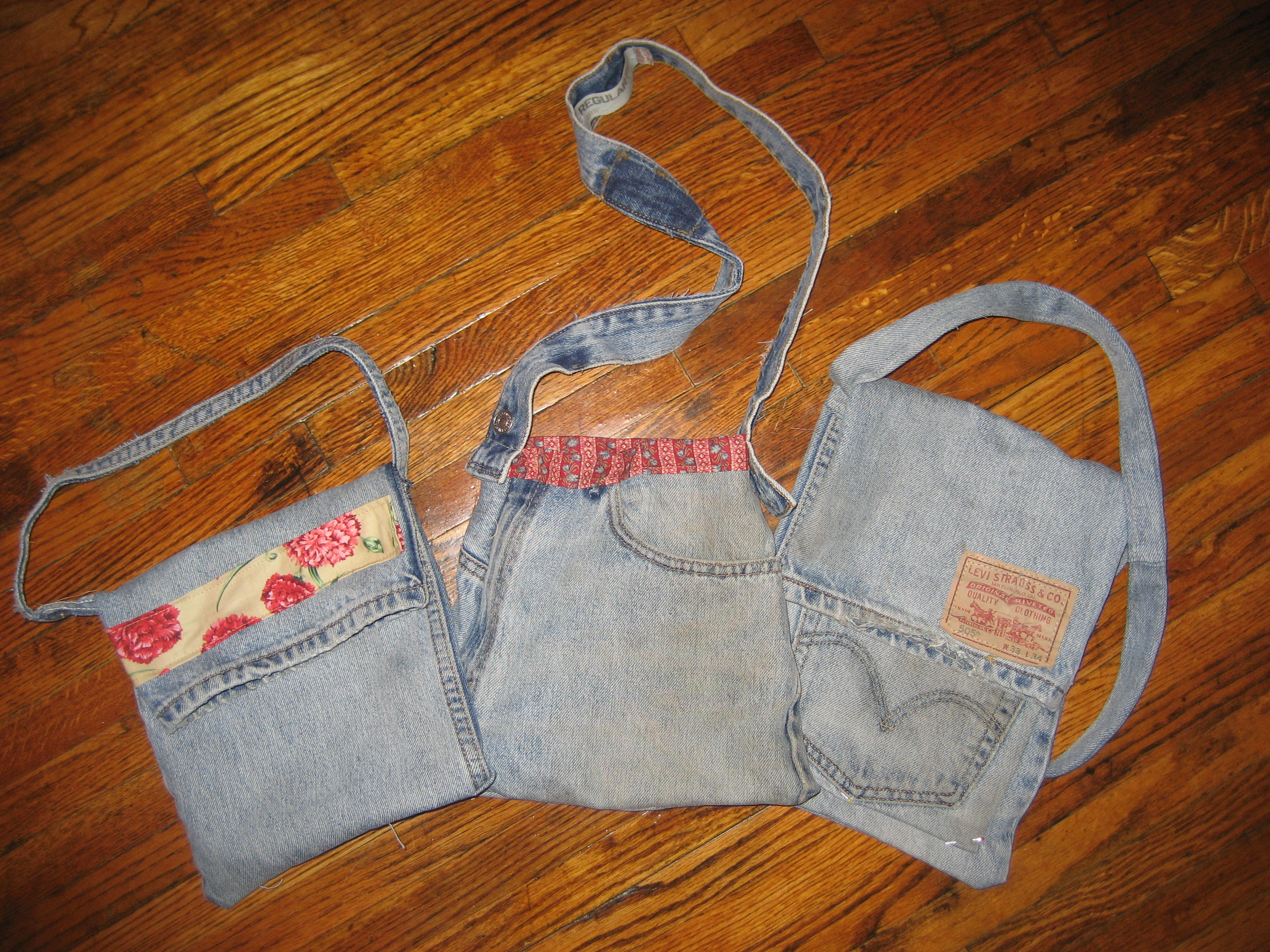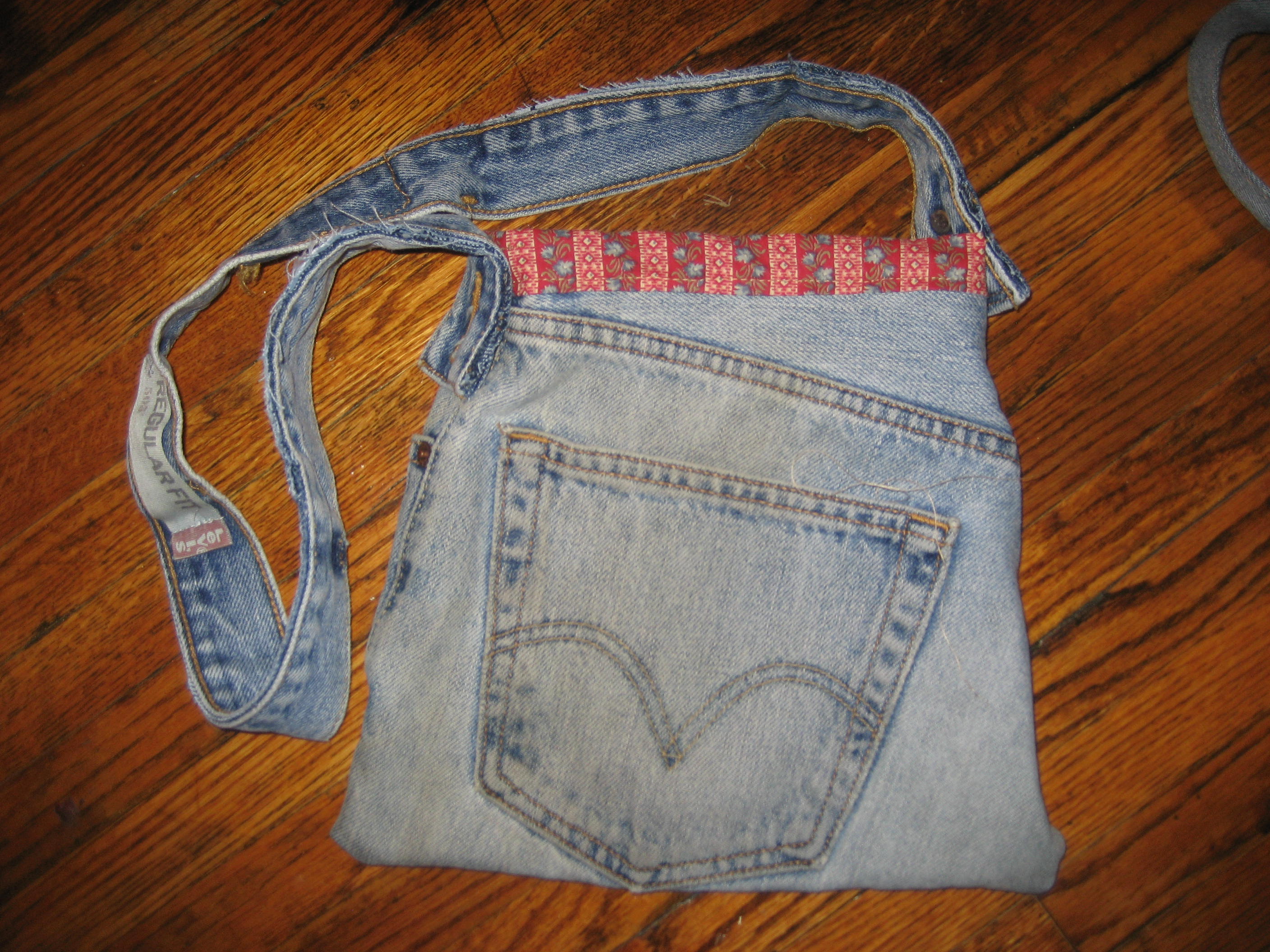 I used the legs for the boy bag (pictured above right) and the little girl bag (pictured above left). This was super easy since all I had to do was stitch up the bottom and add a strap. I made the flaps large so their stuff won’t fall out and didn’t use buttons or snaps so that they can get in and out of the bags themselves. For the middle bag for my oldest daughter I used the left side of the jean with one front pocket and one rear (pictured below). Used the waistband for the shoulder strap and stitched some cute floral fabric along the top to finish it of and cover the cut edge where the waistband used to be.