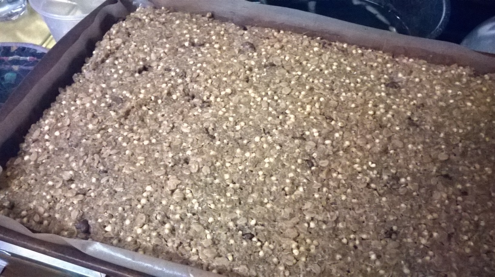 Mix thee dry ingredients. Mix the wet and combine with the dry until there are no more clumps of peanut butter. Line a jelly roll pan with parchment paper. Press the mixture into the pan up to the edges. Cook at 350 for 35 minutes. When just cool to the touch sprinkle chocolate chips on the top and press down with a rubber spatula. Cool completely before cutting. A pizza cutter works great for cutting. These freeze and travel well.