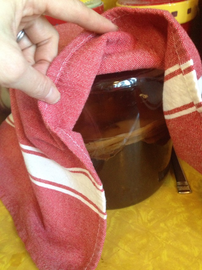 Tea and sugar water cooling.I took my jar out and let it sit on the counter overnight so that it could warm up to room temperature. The next day I made up my sugar and tea mixture. For more specific directions on how to brew kombucha see my other posts – (Cranberry Ginger Kombucha).