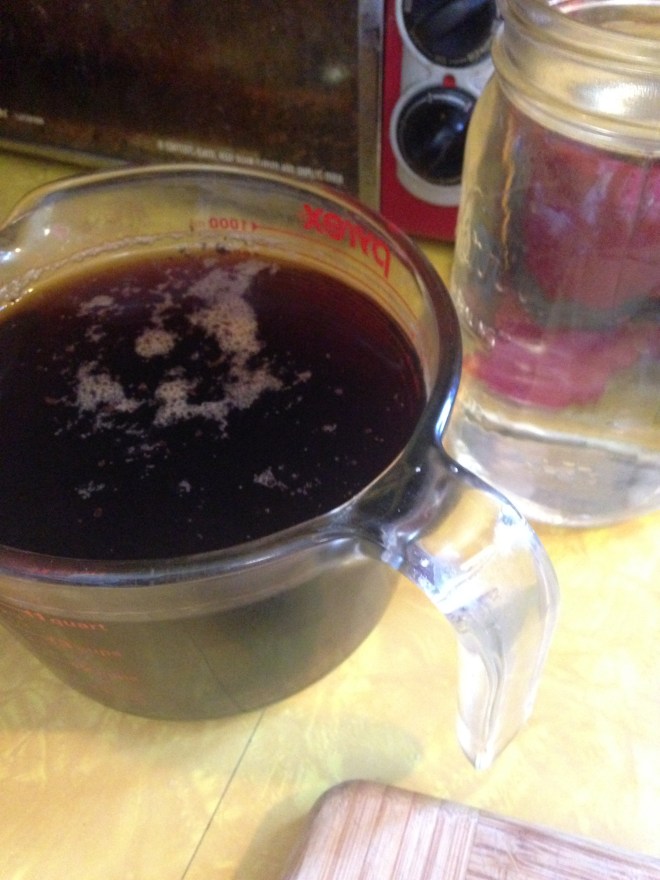 Tea and sugar water cooling.I took my jar out and let it sit on the counter overnight so that it could warm up to room temperature. The next day I made up my sugar and tea mixture. For more specific directions on how to brew kombucha see my other posts – (Cranberry Ginger Kombucha).