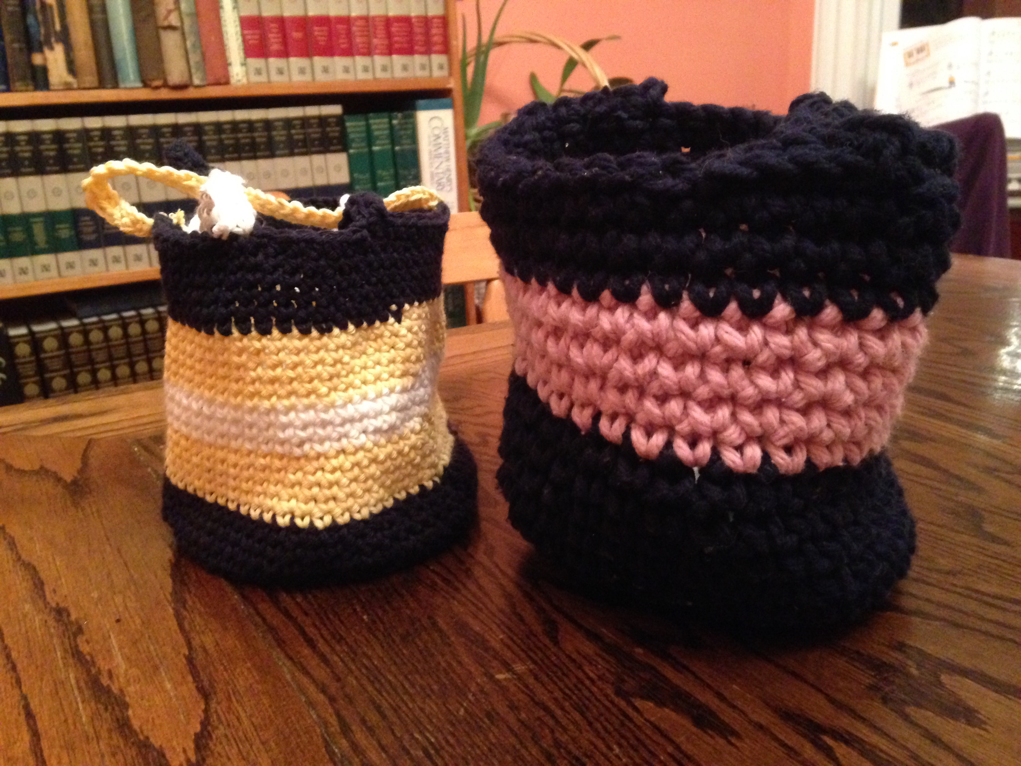 I didn’t use a pattern. Just grabbed some scraps of yarn and started crocheting in a round adding stitches every other round. Once the base is as big as you want, just keep going without adding any more stitches and the sides will start to form. Crochet the handle with some rows of single crochets or a chain.
