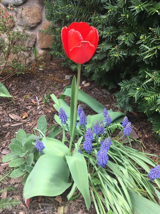 Red Tulip and Muscari or Grape Hyacyinth.