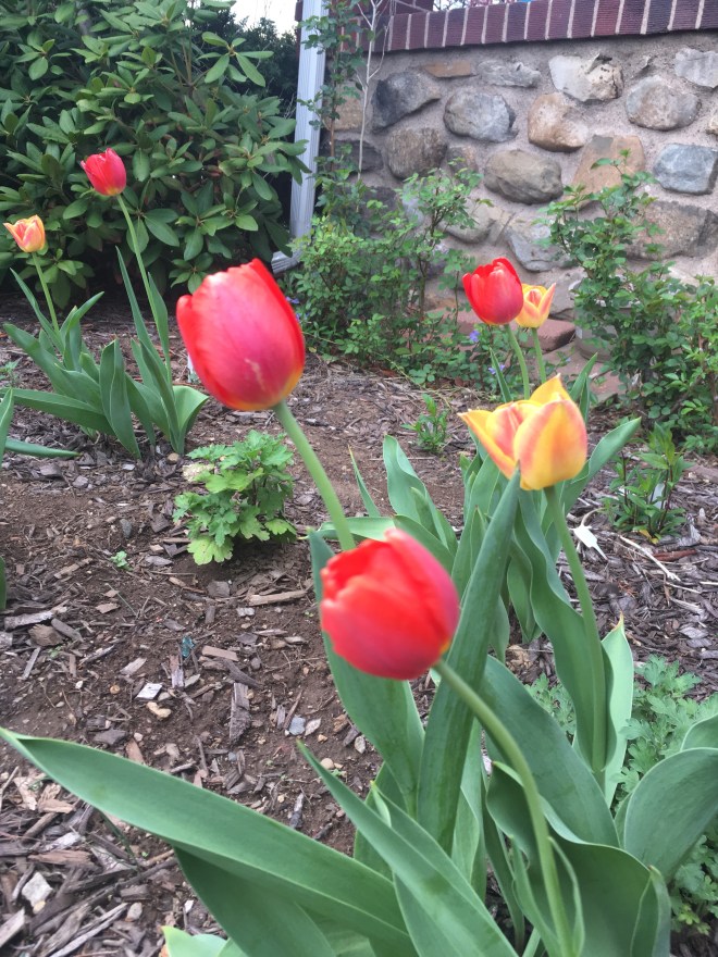 Mixed Tulips with perennials coming up around them.
