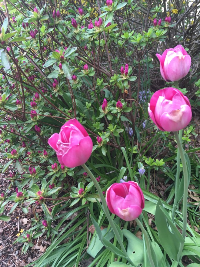 Purple Tulips with an Azalea that is about to burst.