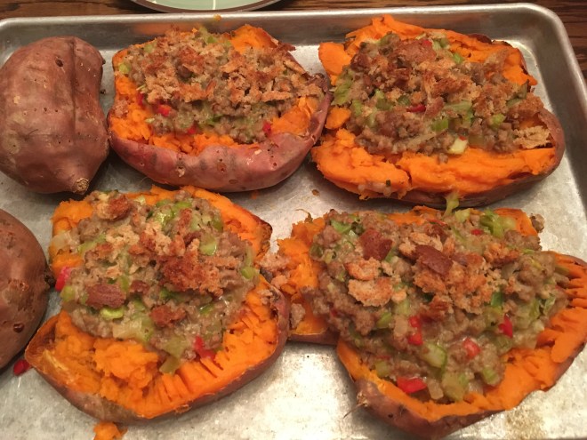 When you’re sweet potatoes are soft when squeezed, remove them from the oven and place on a cookie sheet and slice open. Butter and lightly smash the insides. Then top with the meat mix. I sprinkled buttered homemade crumbled bread on the top. Return to the oven on 400 for about 15 minutes until the bread topping is toasty. Sprinkle with feta cheese crumbles to serve.