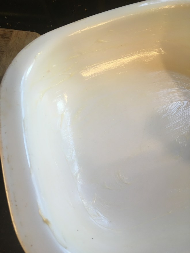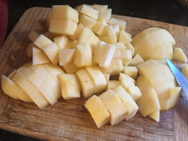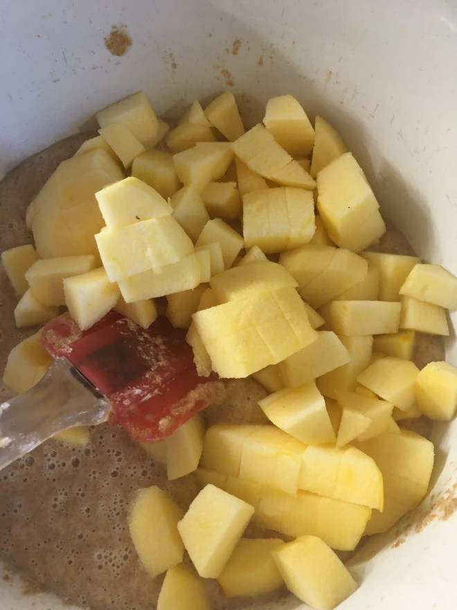 Add 3 approximately 2.5-3 cups of immature (or mature) starter to your mixing bowl. Add 1/2 cup sugar, 1 tsp salt, and about 1/2 cup flour. Stir to combine. Let this mixture sit and bubble while you butter your casserole and chop your apples.