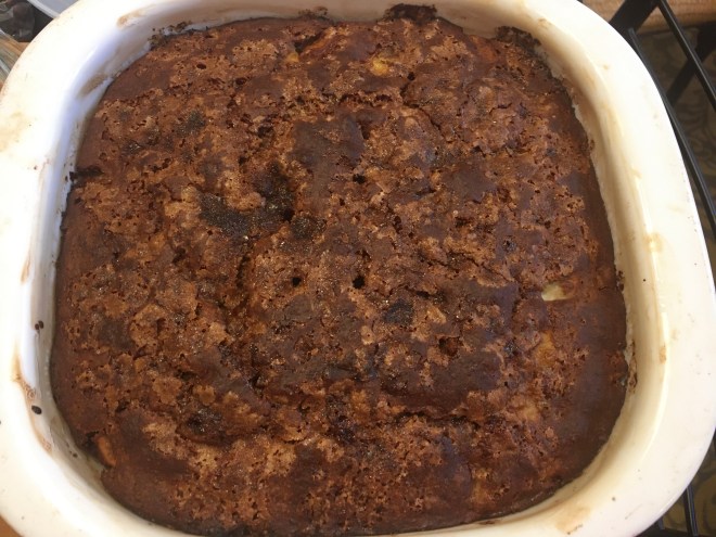 Generously butter a glass casserole dish and set aside. Peel and chop 3 apples. Pour the chopped apples into the bowl with the batter, and add 1 tsp of cinnamon, dash of cloves, 2 tsp baking soda, 1/4 cup cream, 1/4 cup mild tasting oil, 1/4 cup brown sugar. Stir to combine. Then add flour 1/4 cup at a time until your batter is stiff like a cold buttercream frosting. It may not take much flour if your starter is thick. I added less than 1 cup to mine. Once you have achieved the right texture, pour into your prepared baking dish and sprinkle 1/4 cup of brown sugar over the top. Cover and let it rise for 30 minutes. Then back at 400 for 40-45 minutes.