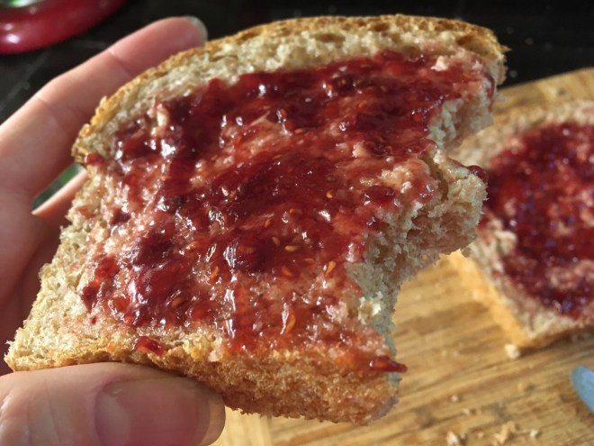 Just can’t beat freshly baked sprouted spelt bread and raspberry jam.