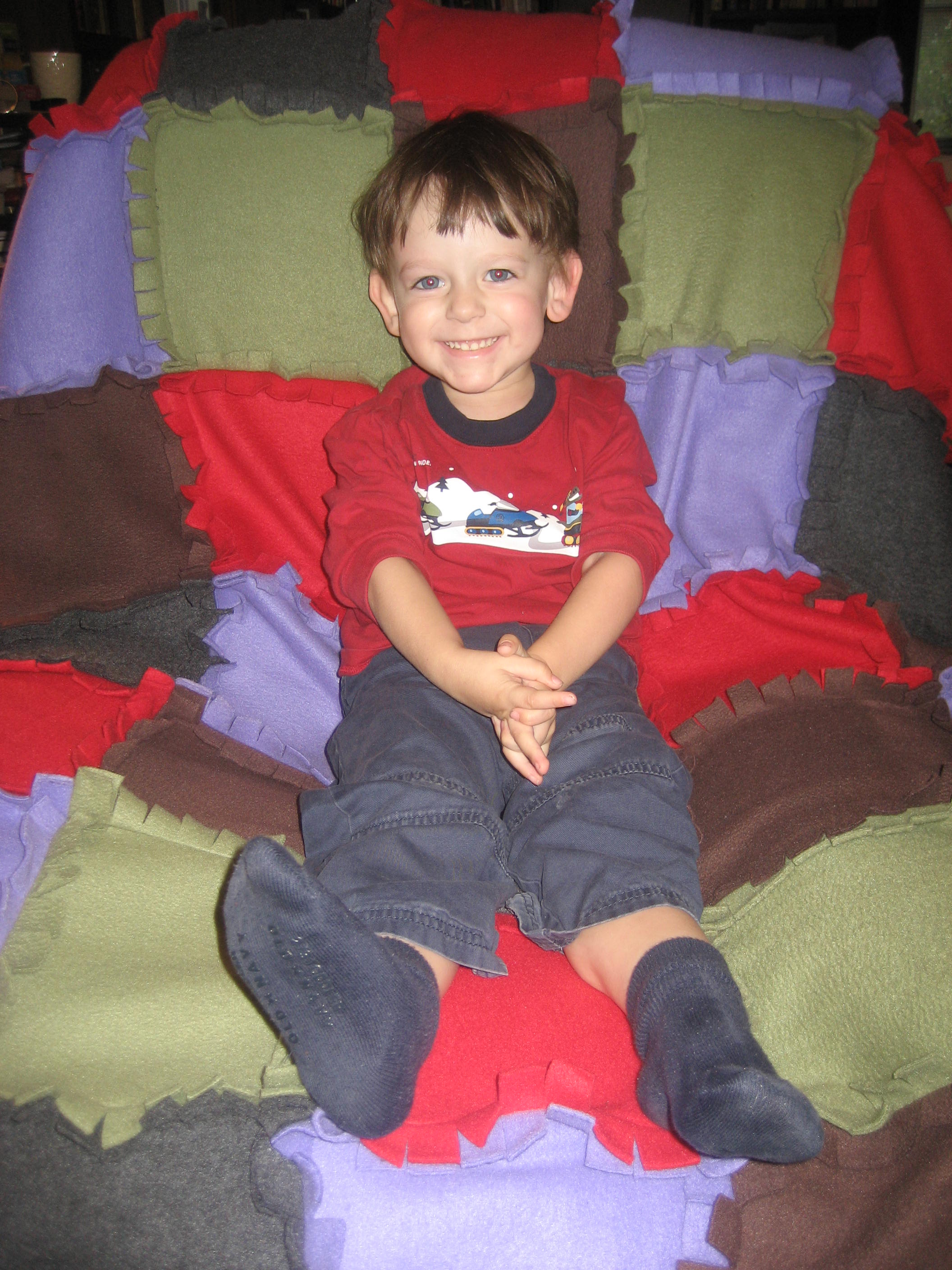 And here is one that I made for my son out of scraps of feece. It’s an easy rag quilt. You just sew the squares in to strips leaving about 1 inch around the edge of each seam, then sew the strips together, and snip the edges when you’re done. In the end it’s something cute and cozy for the winter.
