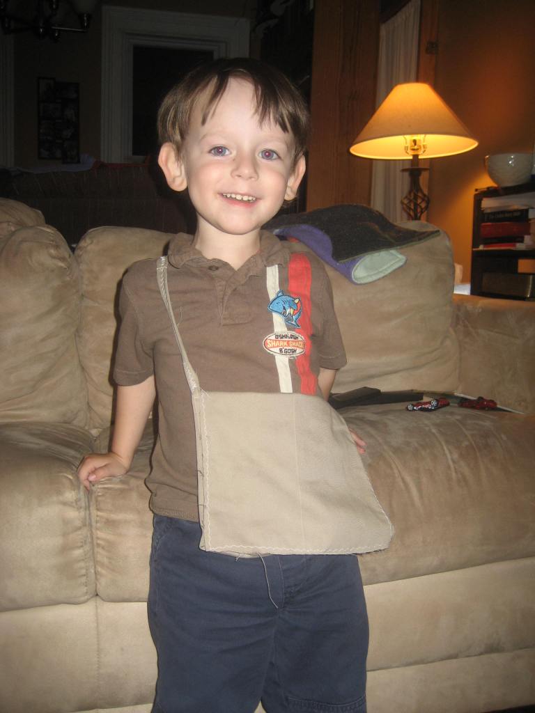 Here is my little man pretending to be Flynn Rider from the Disney movie Tangled. He wanted his own satchel so we made one up in about a half hour from pant leg of one of his daddy’s old pair of kakhi pants. If old clothes are too ratty and worn to give away and you have the space to save them it’s always fun to come up with new things to turn them into. It’s recycling before there was recycling. I’m sure that Maggie and her girls did that. There are several quilts that were made out of old dresses or baby clothes that are floating around our family closets. Look through your closet and see what you can repurpose. Completed 11/9/11.