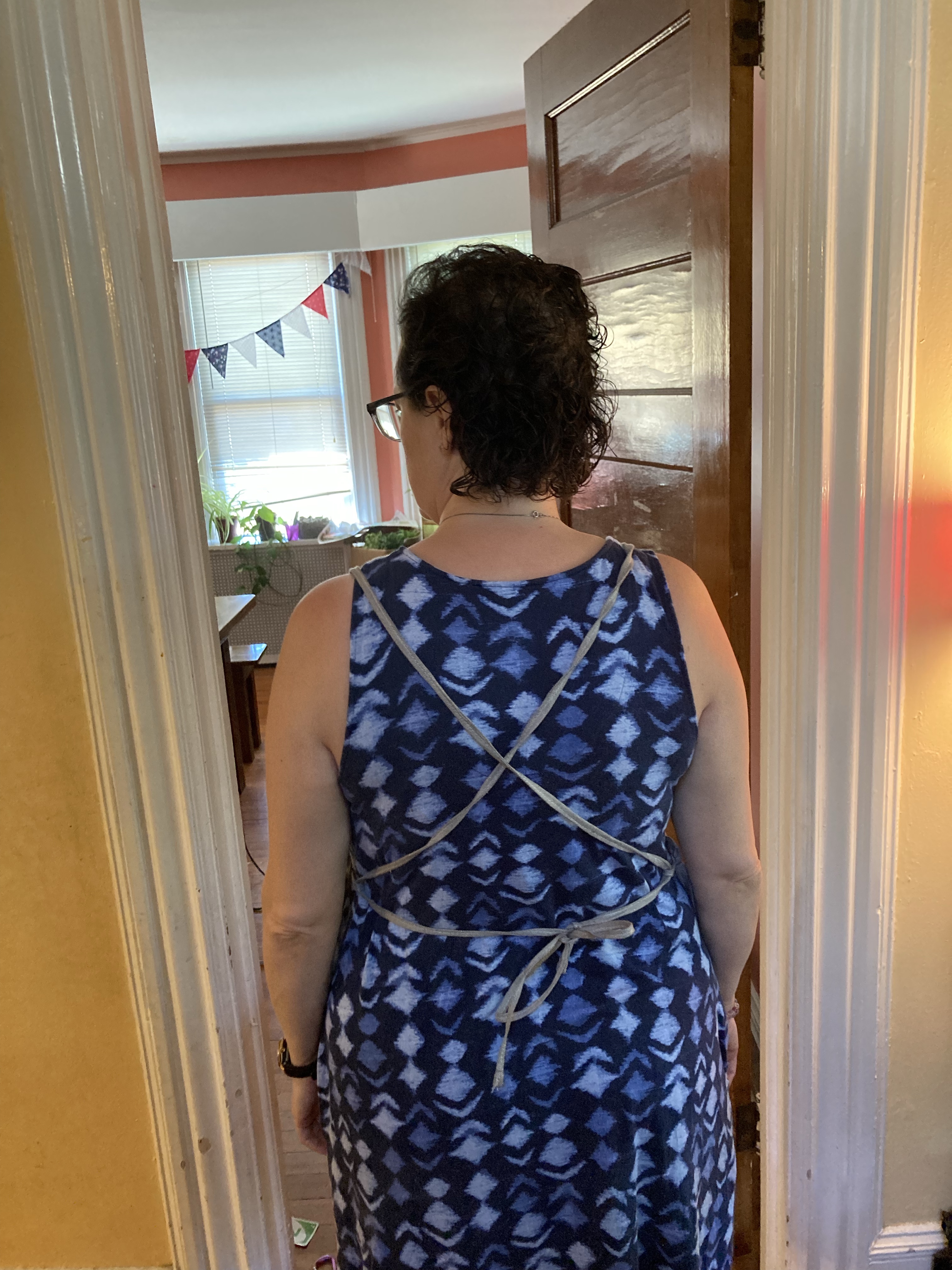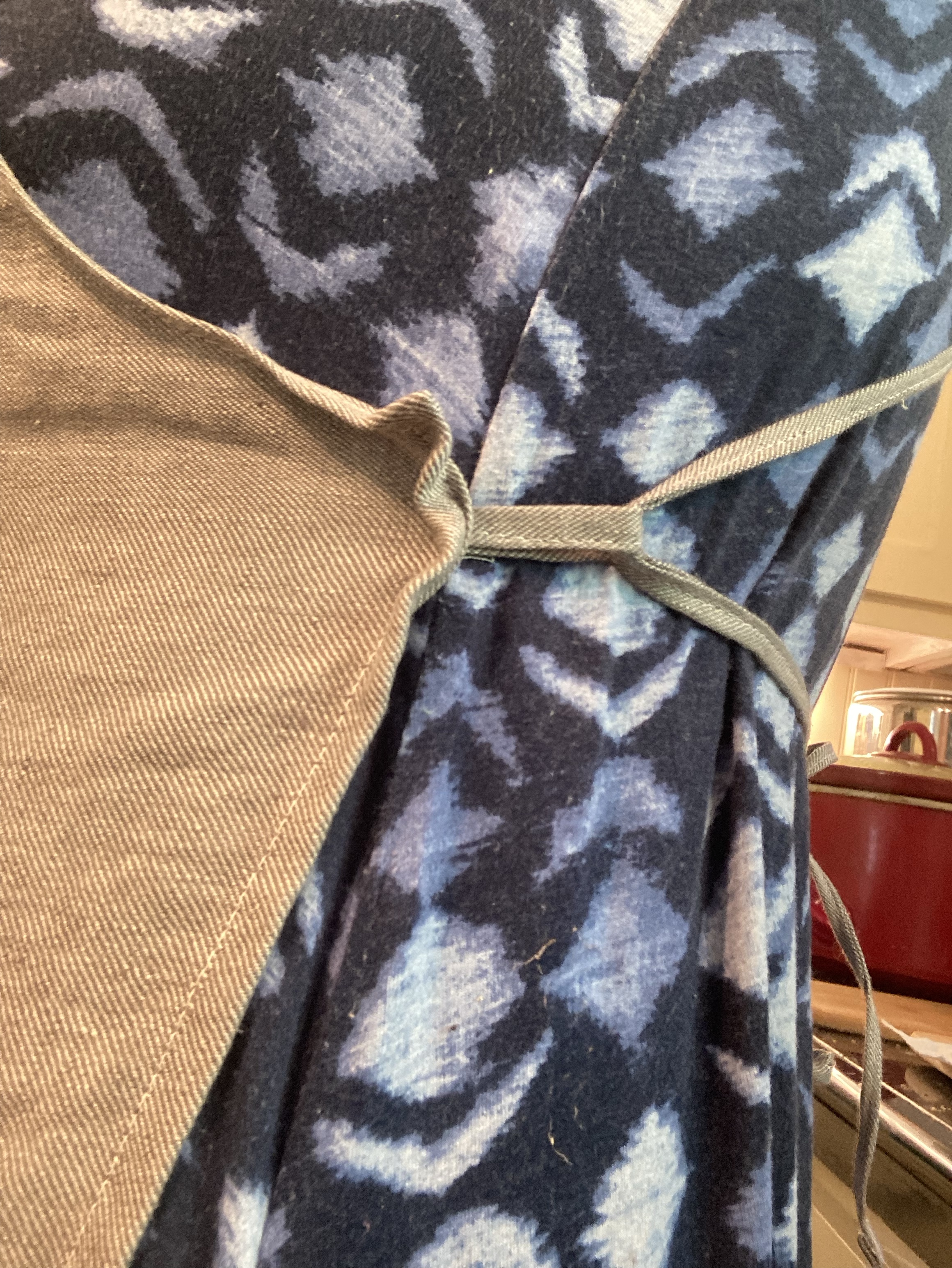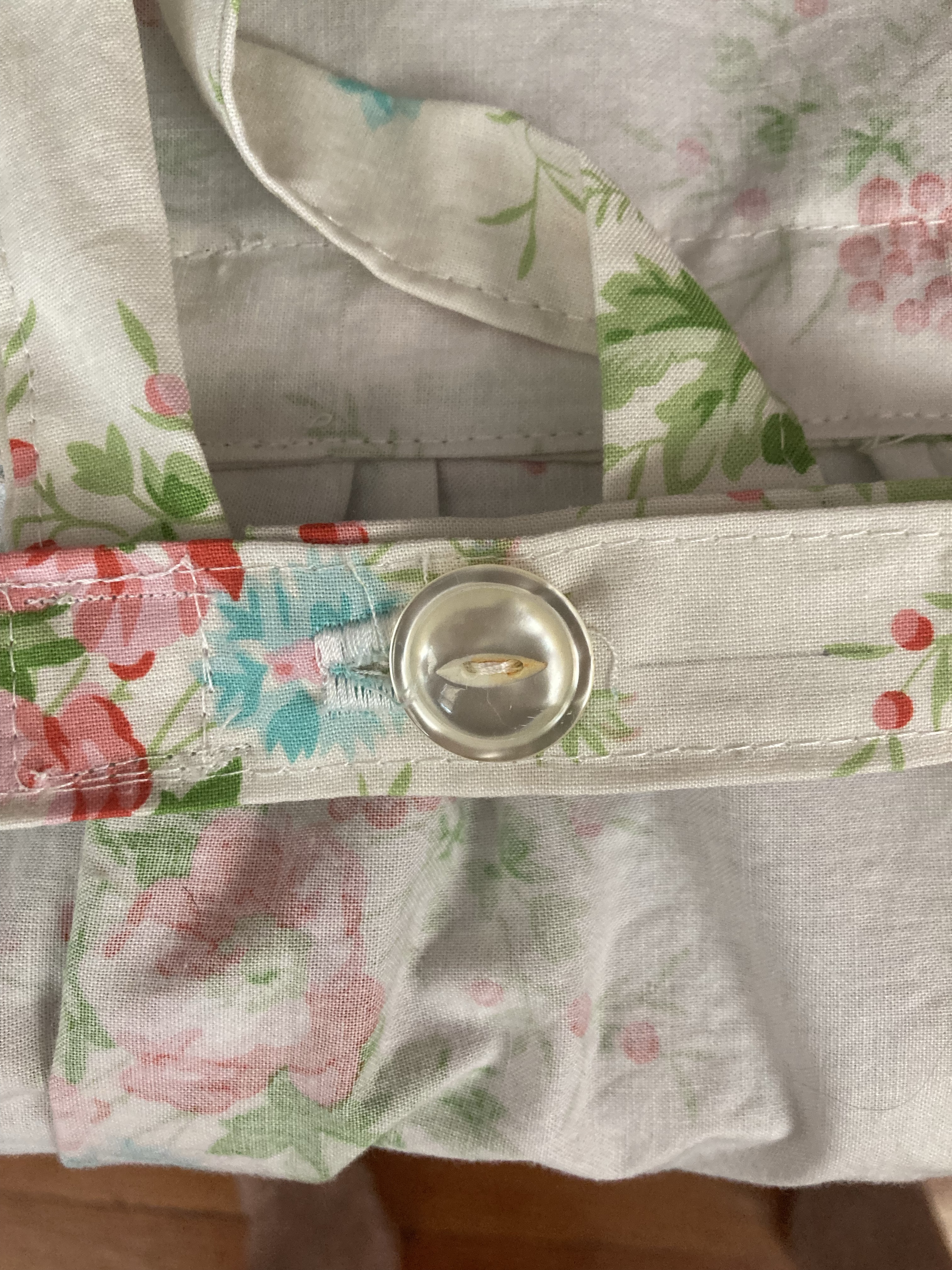 I didn’t have enough fabric to make apron ties so I added a button closure to the end of the waist band. I think I’m going to like it better than tying apron strings.