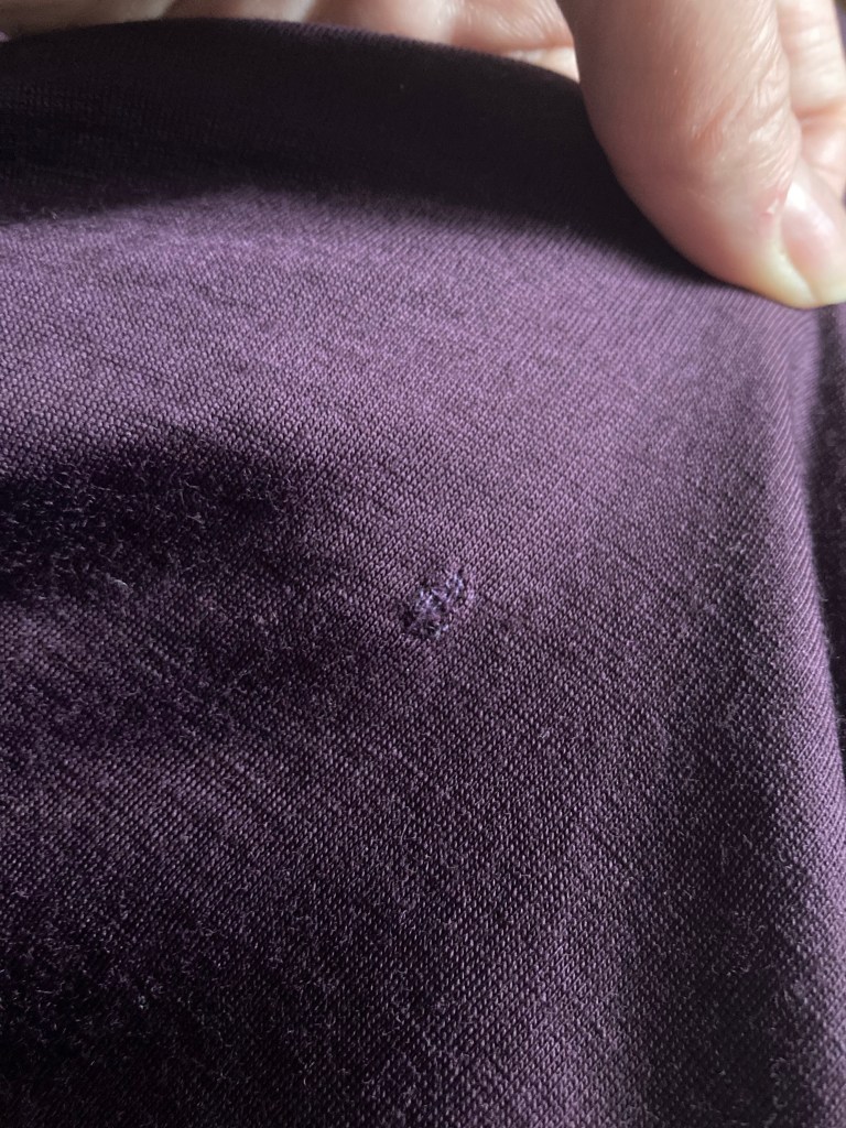 I made it 100 days with absolutely no damage to my other dress so this is in no way representative of the quality of the piece. What to do? Well, thankfully I have some sewing skills and I have experience repairing woven fabrics when some of my woven wrap baby carriers have occasionally have had a snag, so all was not lost. I didn’t have an exact match on the thread, but I repaired it by reinforcing the edges with a straight stitch around the hole so that the damaged area didn’t spread. Then I grabbed the open loops and connected them creating my own warp and weave. I’m happy with the result and the repair is hardly noticeable.