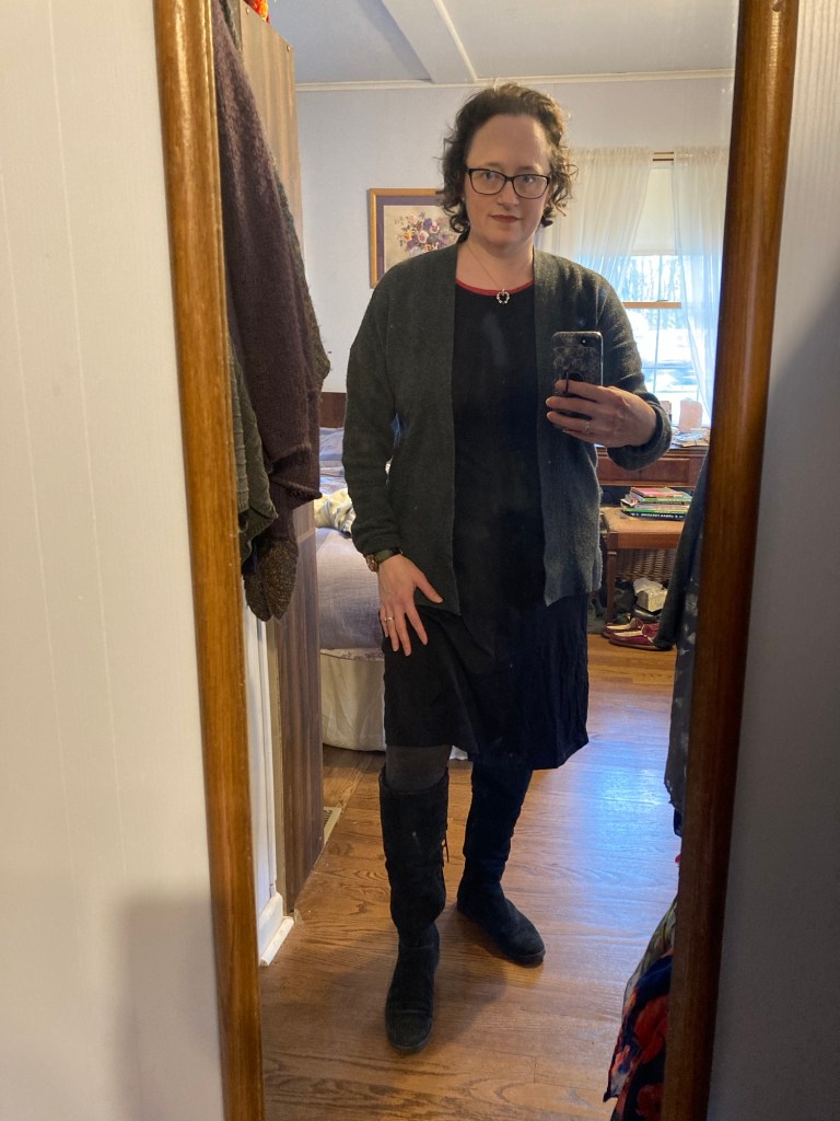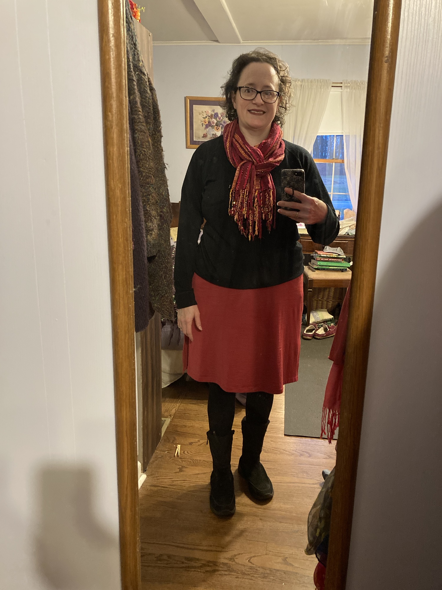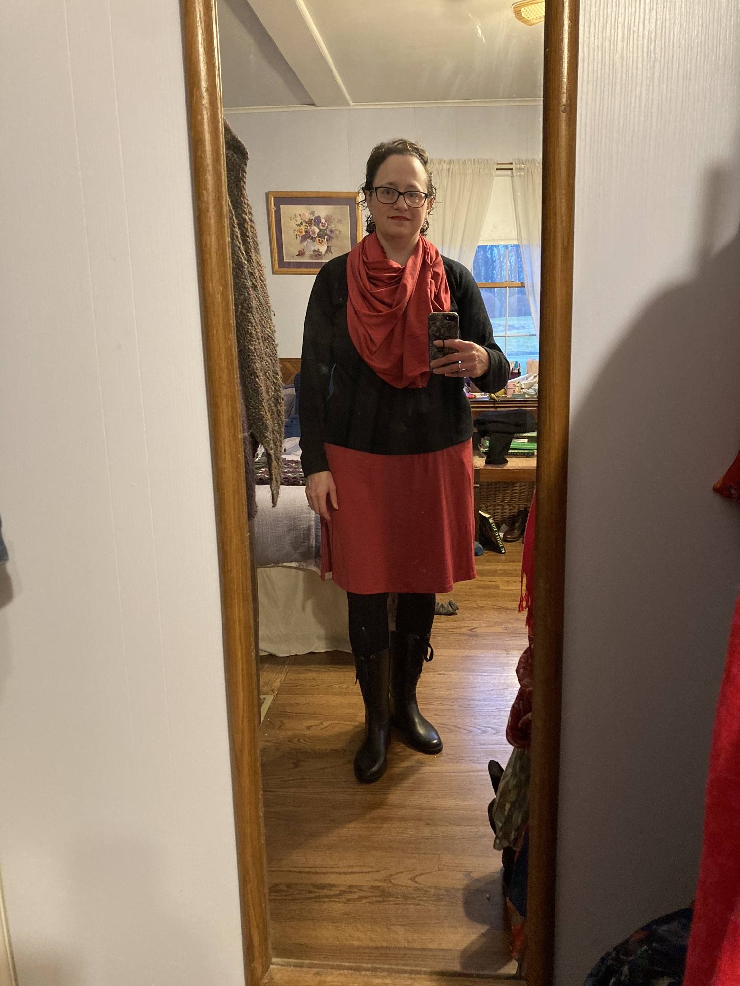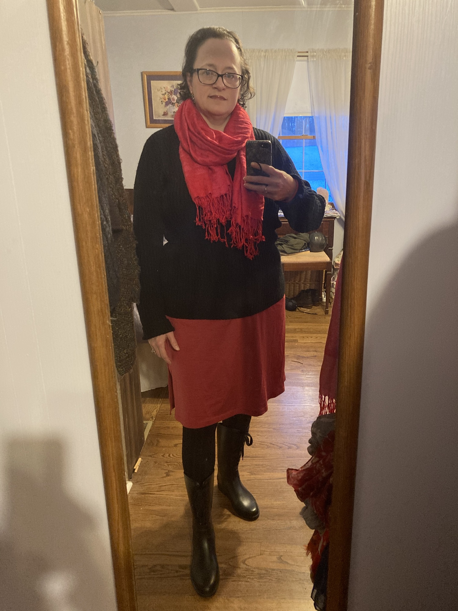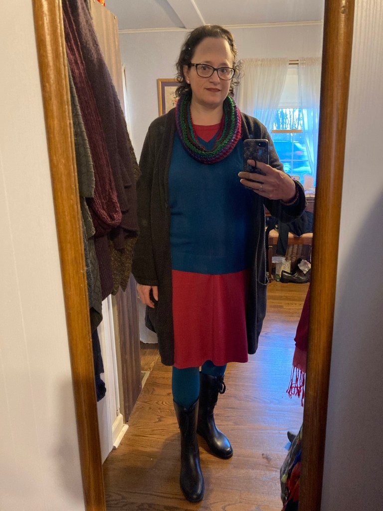The challenge peaked my interest. Not necessarily for the gift card, but for the challenge of it. But, I set it aside. I’d never spent that much money on a piece of clothing before. I didn’t even pay that much for my wedding dress off eBay. But, I kept thinking about it and coming back to it in my mind. So, I decided to try it. I ordered a Garnet Summer dress. I chose it for the versatility, midi length, and cut. This particular dress is reversible, can be worn alone as a tank style, or layered for cold weather. The midi length was important to me as I don’t wear short dresses. I wanted something below the knee but didn’t want something so long that I couldn’t also wear it in summer. I wore this dress for 100-days through the fall and winter and I had such a good time! Below are a photos of some of my favorite outfits. Maybe you can get some styling ideas from some of my photos below.
