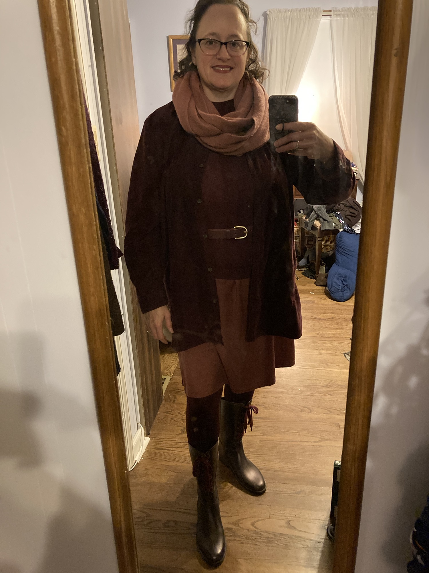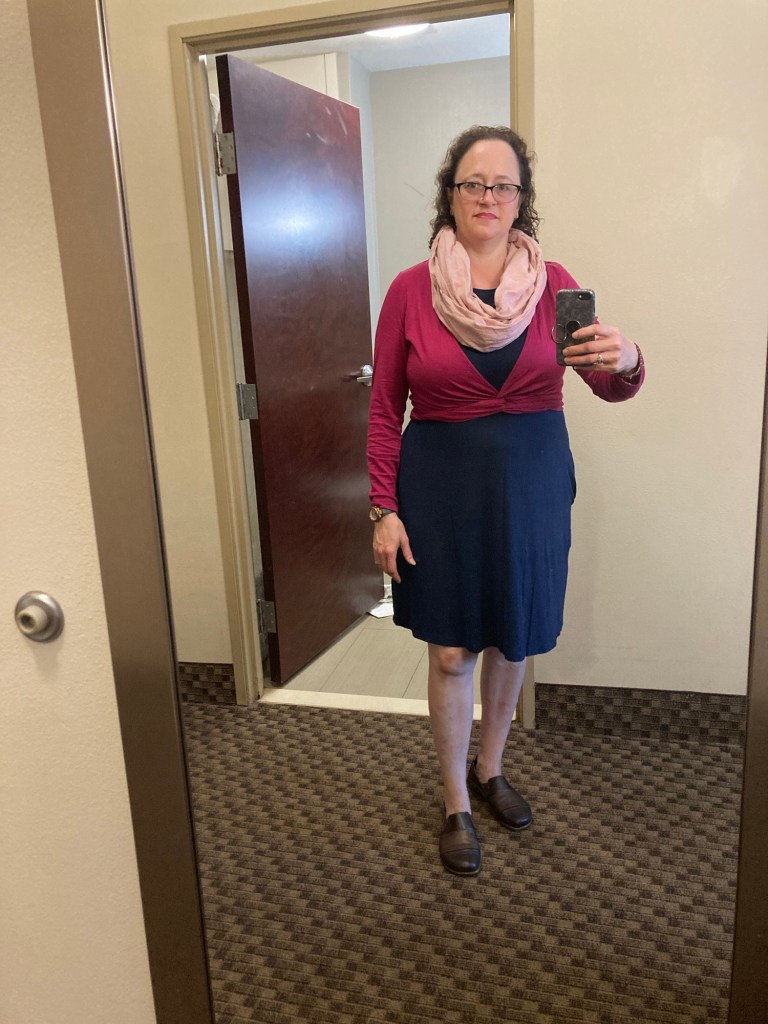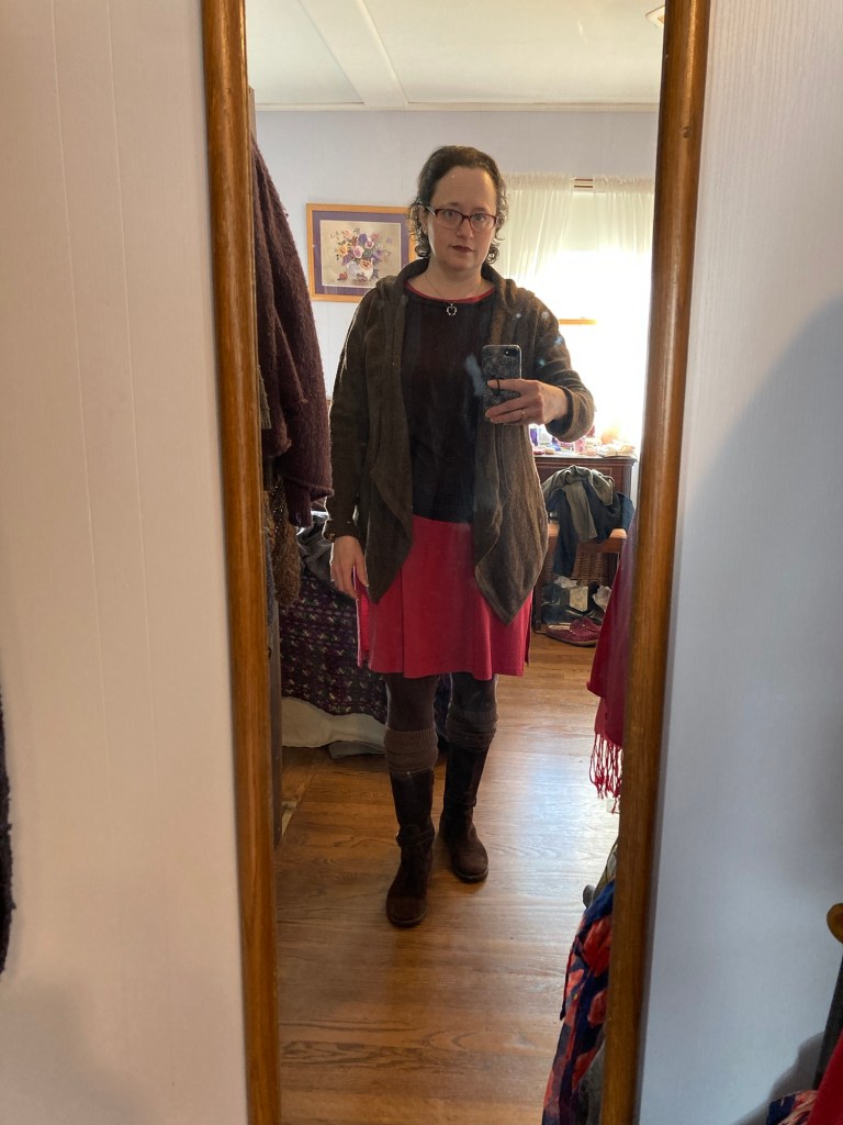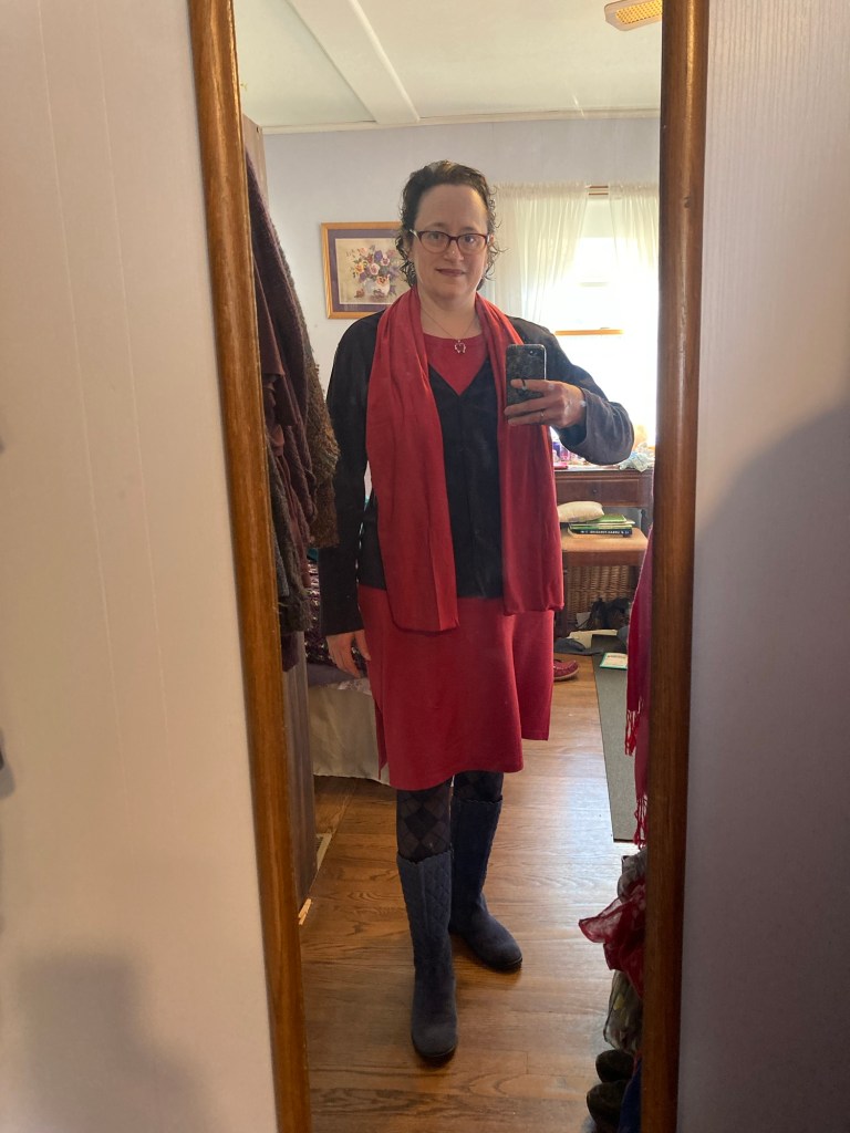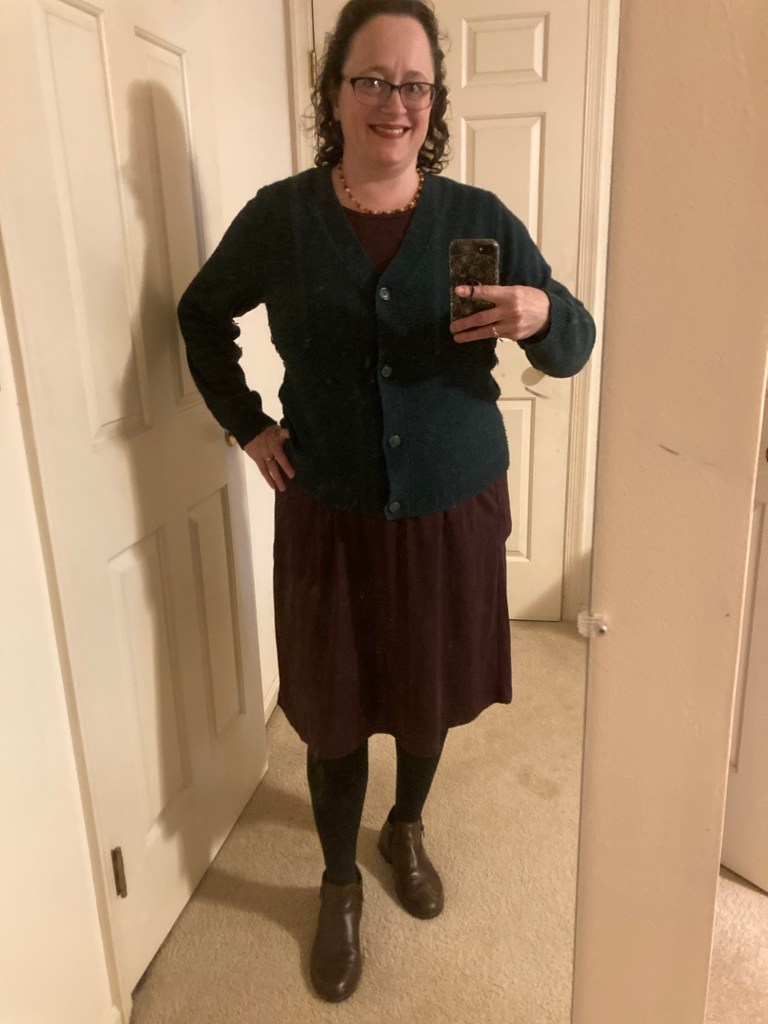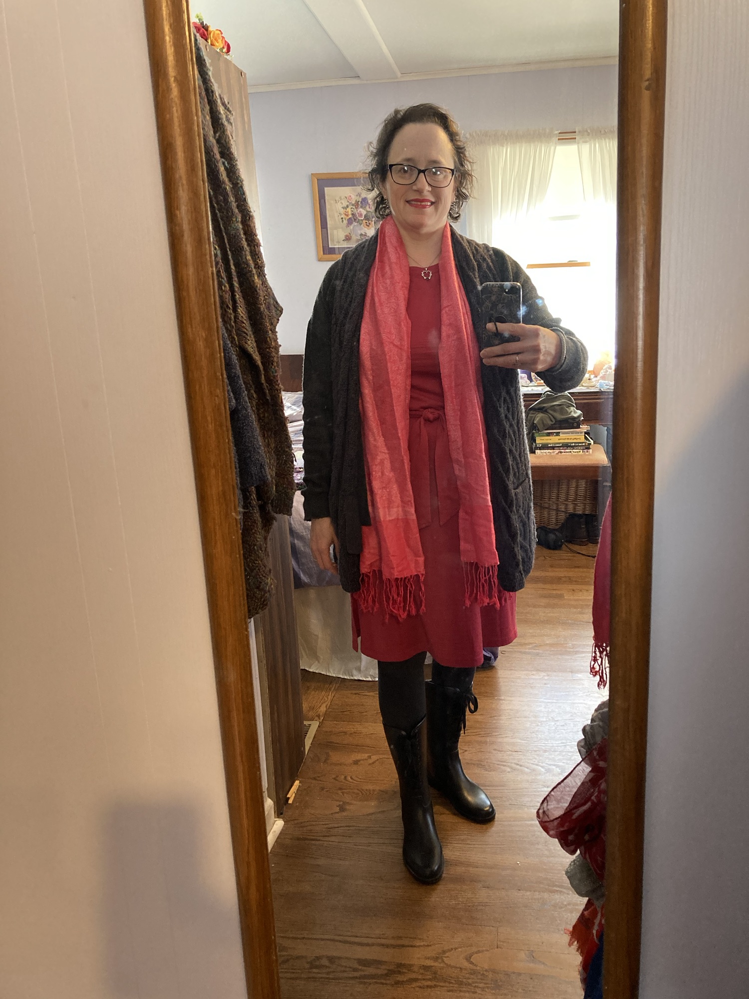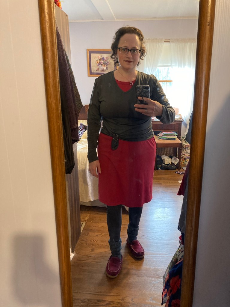 The challenge peaked my interest. Not necessarily for the gift card, but for the challenge of it. But, I set it aside. I’d never spent that much money on a piece of clothing before. I didn’t even pay that much for my wedding dress off eBay. But, I kept thinking about it and coming back to it in my mind. So, I decided to try it. I ordered a Garnet Summer dress. I chose it for the versatility, midi length, and cut. This particular dress is reversible, can be worn alone as a tank style, or layered for cold weather. The midi length was important to me as I don’t wear short dresses. I wanted something below the knee but didn’t want something so long that I couldn’t also wear it in summer. I wore this dress for 100-days through the fall and winter and I had such a good time! Below are a photos of some of my favorite outfits. Maybe you can get some styling ideas from some of my photos below.
