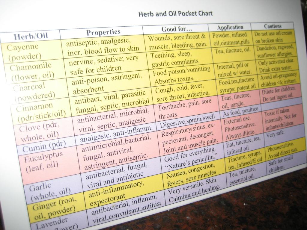 Laminated, 7×4″ Herb and Oil pocket chart. Great for an herbal first aid kit.