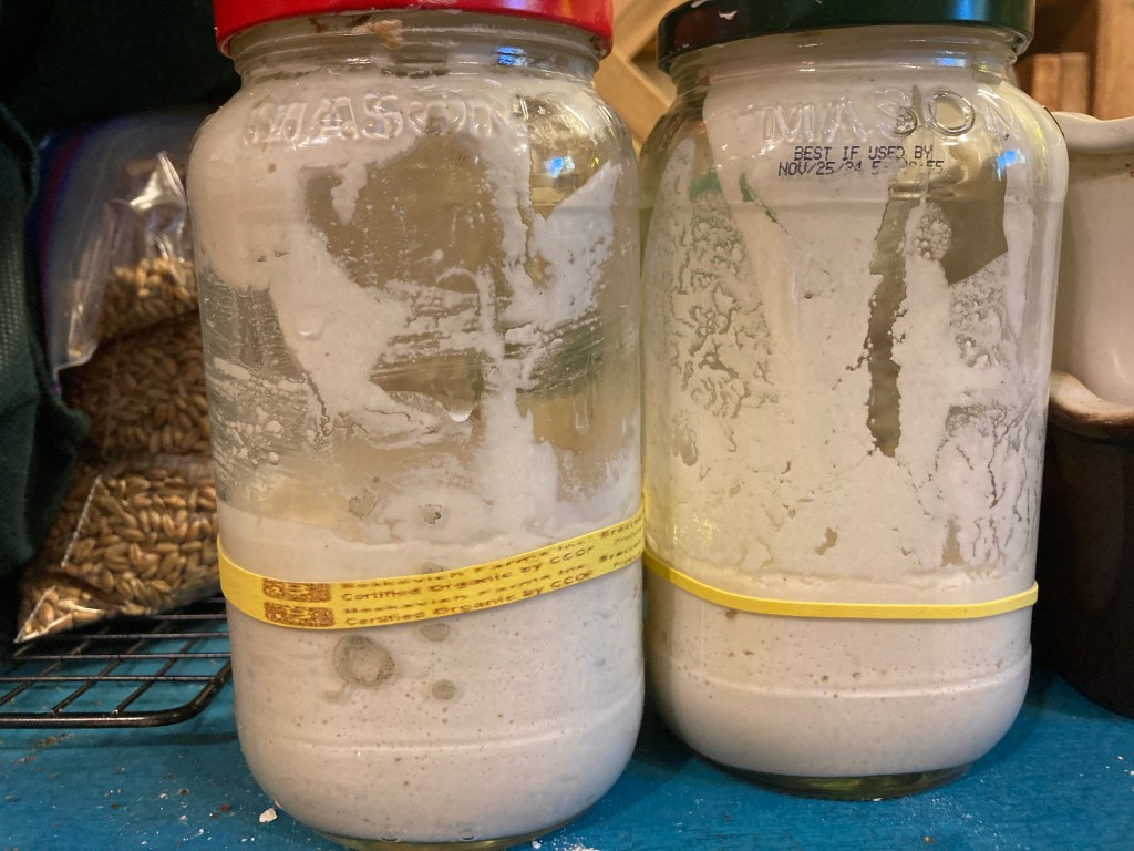 These are two gluten-free starters made from brown rice and quinoa. They are just starting to show signs of life. See the tiny bubbles?