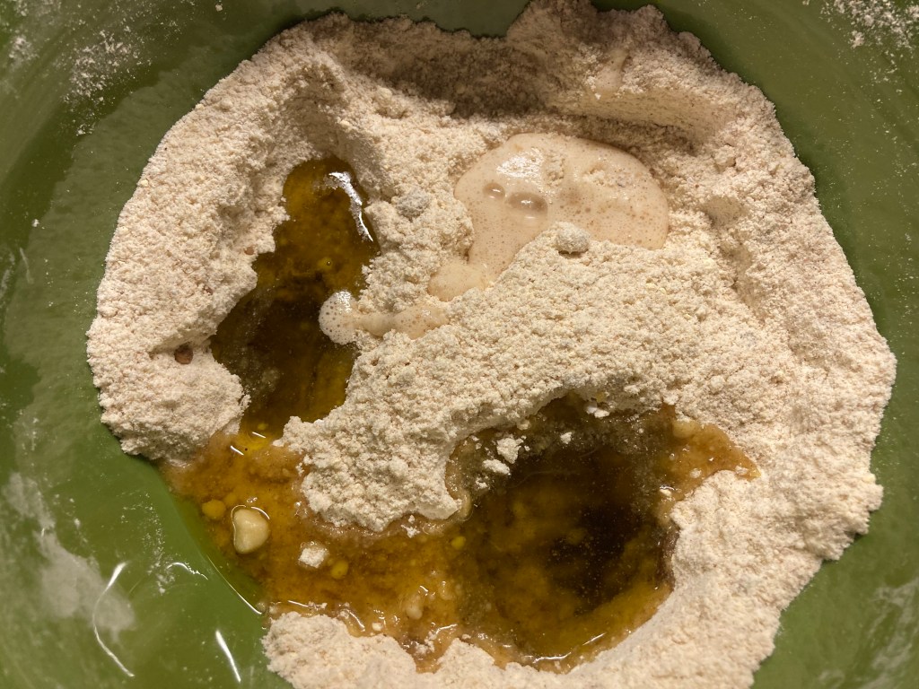 Stir to combine. Make 3 small wells or depressions in the flour and add the following….