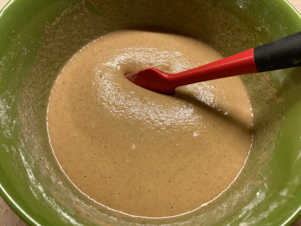 Mix together until there are no more lumps. Batter should be the texture of a very thick pancake batter or thick oatmeal. If it is too thin add a little more of one of the flours until the correct texture is achieved.