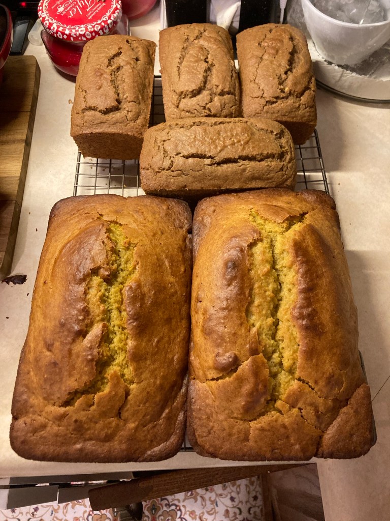I made the wheat version (large loaves)for the family and the gluten-free version (mini loaves) for me. If you want to try it, the wheat recipe can be found on the Family Favorites page, and the Gluten-Free version can be found on the Allergy-Friendly page. I also use one of my favorite substitutions for this batch. I substituted puréed butternut squash rather than using canned pumpkin. I actually like it better with the squash. The color isn’t as dark orange as with canned pumpkin, but I think the texture and flavor is better.
