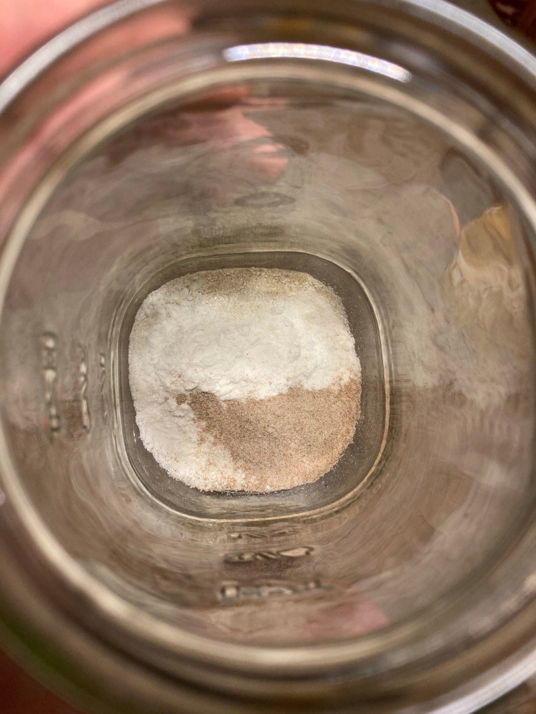 Next, into your quart size jar, add 1/2 tablespoon of water for each of the flours that you used. So if you used two flours, add 1 tablespoon of water. 3 flours – 1.5 tbsp water, 4 flours – 2 tbsp water, and so on.