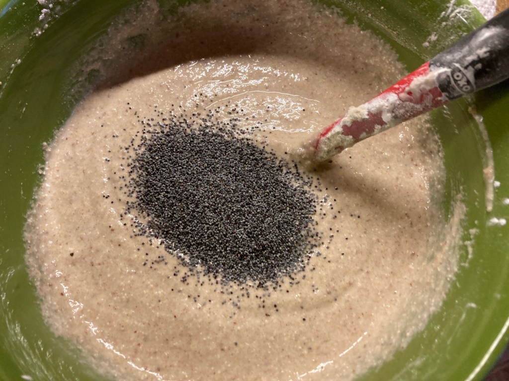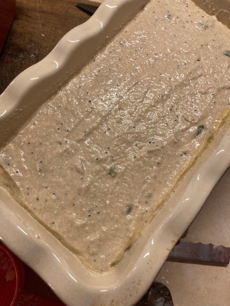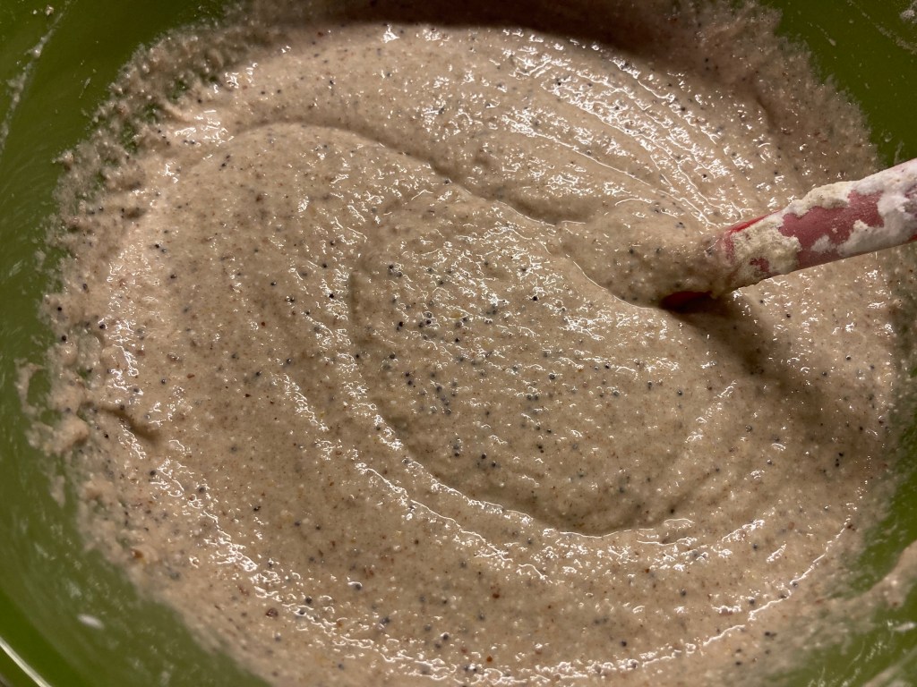 Preheat the oven to 450 degrees. Drain the water from your soaked seeds. Remove your bowl from the fridge and add your seeds to the batter. Mix well until they are all distributed. Then pour your batter into a greased loaf pan.