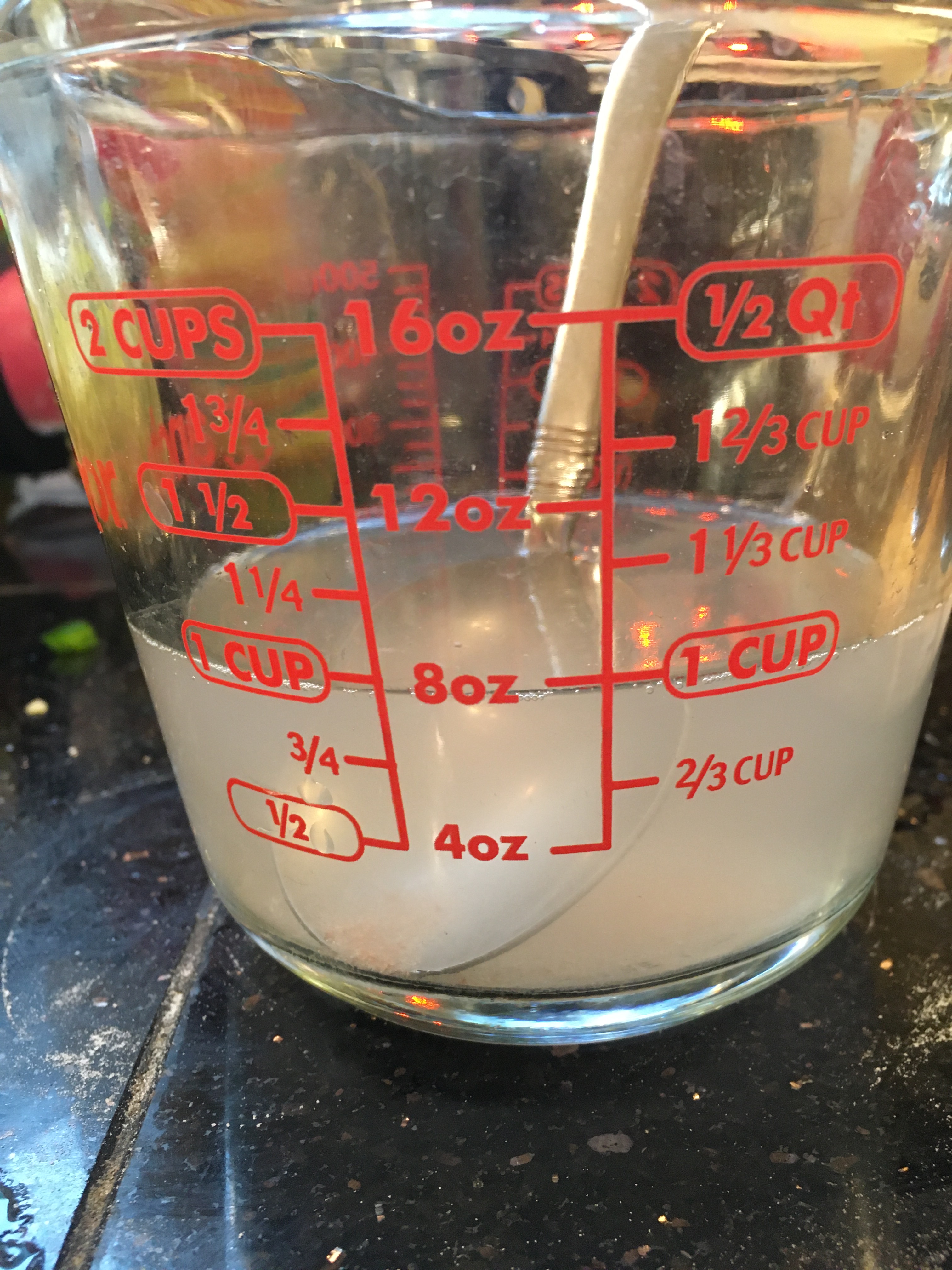 Peel garlic and onion. Coarsely chop the onion. Cut and remove the seeds from the jalepenos. Put it all in the food processor. Pulse until finely chopped. Put in a sterilized (scald the jar with boiling water) mason jar (or reuse any glass jar that you have on hand which is what I did). Now pour salted water (1 tsp. sea salt for every cup of water) over your vegetable mix until all the veggies are covered and there is at least 1 inch between the water level and the top of the jar. Let it sit on the counter for 3-4 days and keep in the fridge after that. It’s good to add a little spice to anything that you’d like to make spicy.