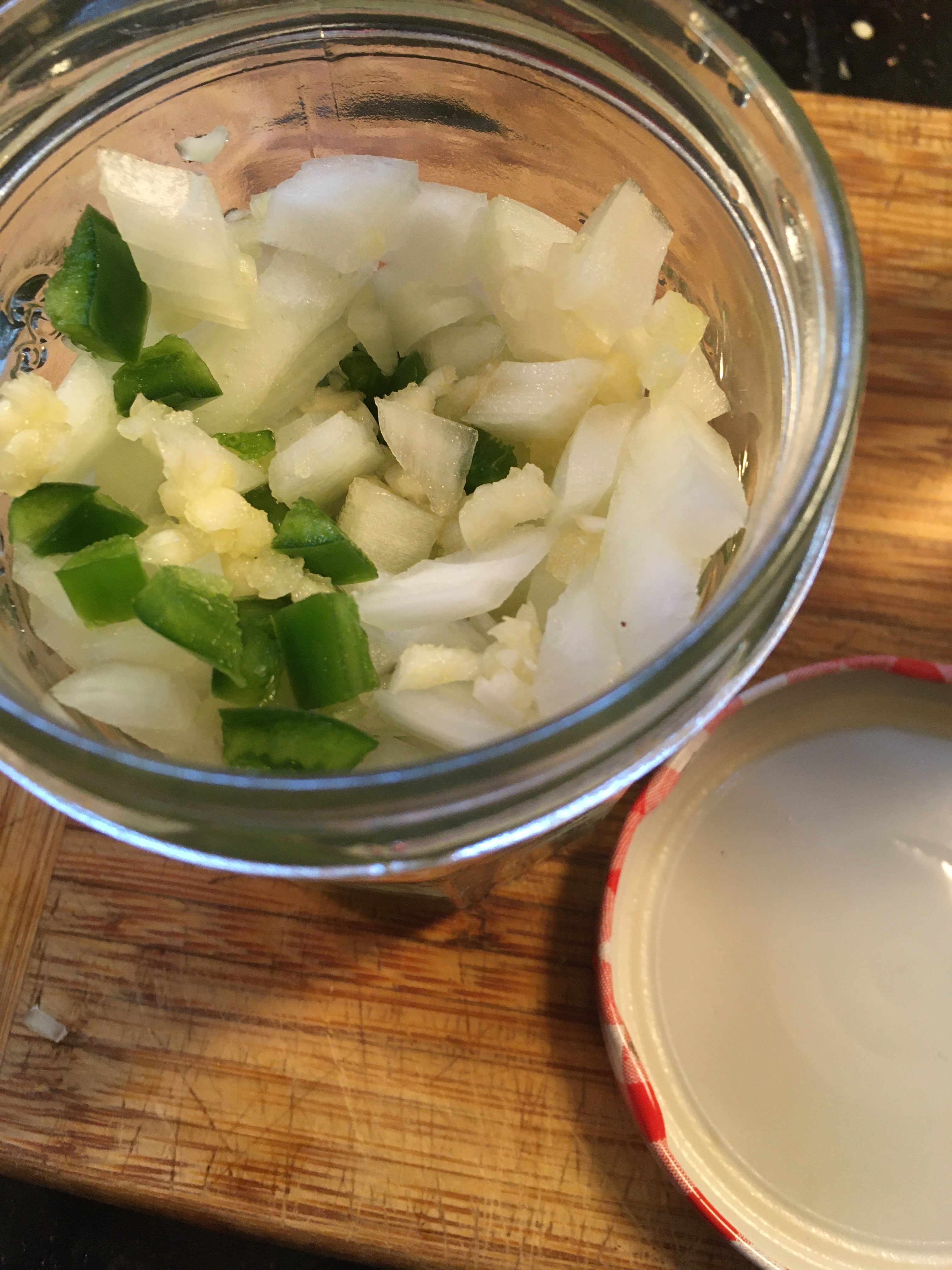 Since I’ve been reading up on fermented foods lately. Tried a couple of things and I finally decided that I should make a fermented version of the foods that I use the most for seasoning when I cook – garlic, onion and jalepenos. Well, I did and it is GOOD! And it’s super easy. If you like spice you will love it. And you get all the good health benefits of garlic, onions and jalenpenos and all those good bacteria that you let grow in there. Here’s what you do….