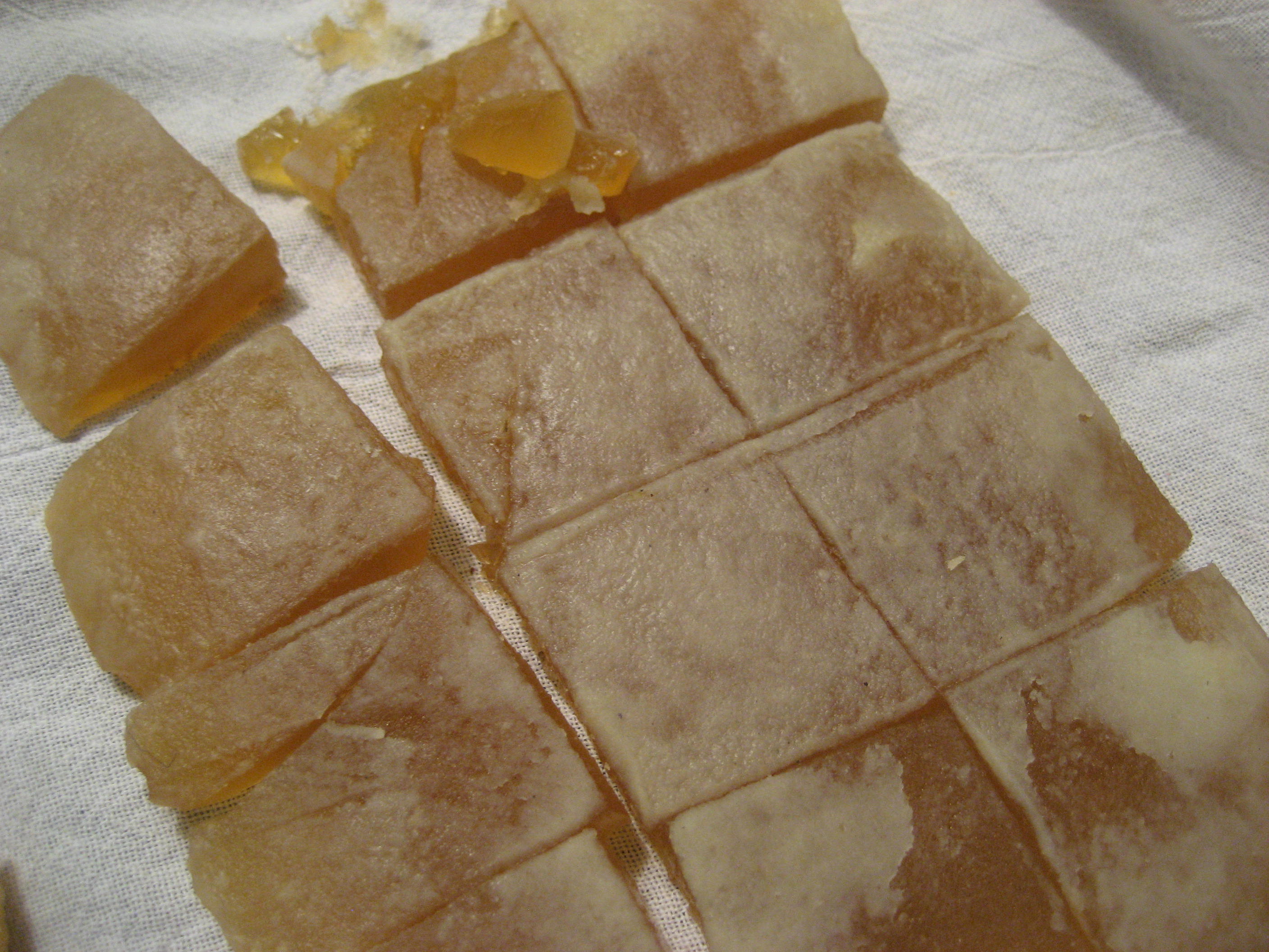 Strain your broth, reduce by half and then using a 8″x8″ pyrex baking pan pour in your concentrated stock and let it cool to room temperature. When cool cover with a lid if you have one (if not use tin foil) and refrigerate for several hours (or overnight) until chilled. The broth should now be well congealed and have a firm, gelatin like texture. Scrape the fat off the top and reserve if you plan on using it for frying (or re-seasoning your cast iron). Cut the gelled broth into cubes. Next we will turn them into preserved boullion cubes by preparing a drying rack for them.