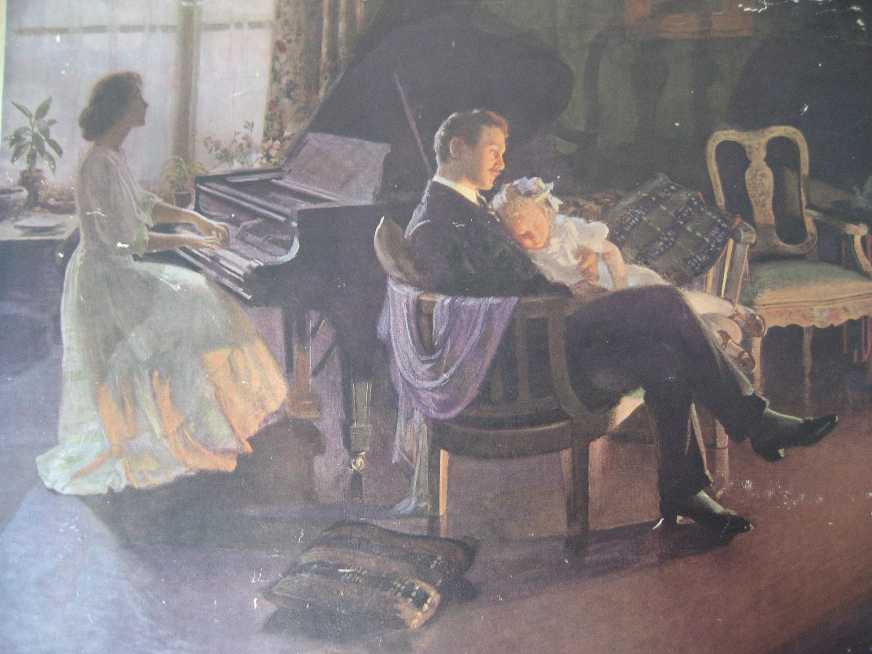 Maggie’s parlor contained a “grand” piano and a bed. Simple and functional though it was, it would have been a place of family gatherings in the evening. And my aunt tells me where all the cousins would sleep when everyone came to visit. Even though the parlor depicted here is much finer than Maggie’s would have been, it depicts the quiet serenity of sitting with your family on a peaceful evening listening to a lovely song. I imagine the woman at the piano to be Maggie, the gentleman in the chair her husband James, and the curly haired girl to be one of their six girls whom they loved dearly.